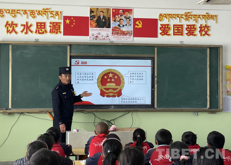 图为岗嘎边境派出所民警在岗嘎镇中心小学教室内为学生开展爱国主义教育 摄影:陆佳希