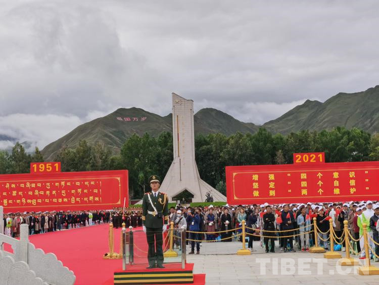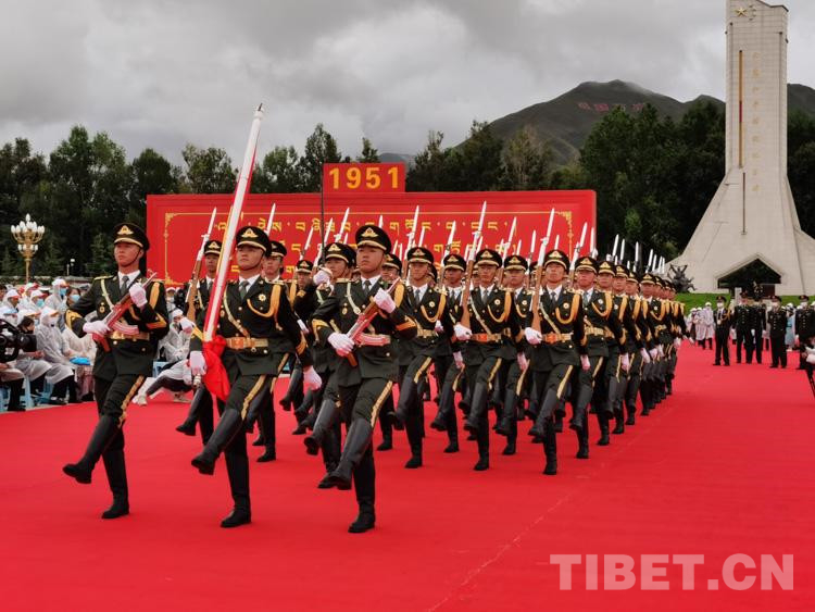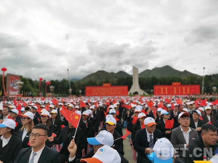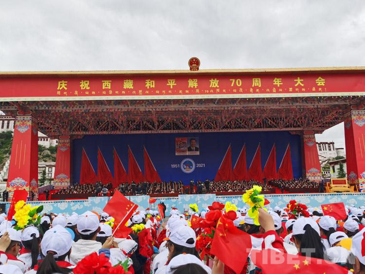 上午10时,齐扎拉宣布大会开始。全场起立,奏唱国歌,鲜艳的五星红旗在布达拉宫广场冉冉升起。在热烈的掌声中,尤权宣读了中共中央、全国人大常委会、国务院、全国政协、中央军委关于庆祝西藏和平解放70周年的贺电。