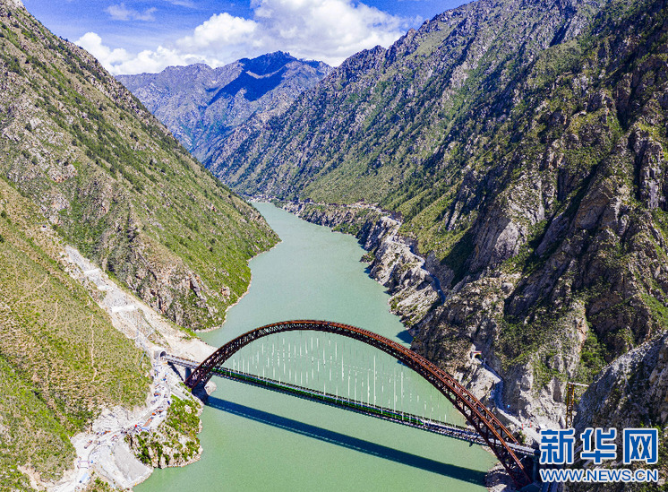 6月17日,试运行的复兴号列车行驶在川藏铁路拉林段藏木特大桥(无人机照片)。新华社记者 普布扎西 摄