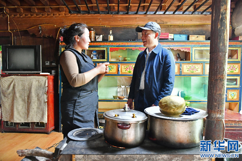 6月28日,广东省援藏干部胡雄英(右)向经营家庭旅馆的藏族群众了解经营情况。新华社记者 孙瑞博 摄