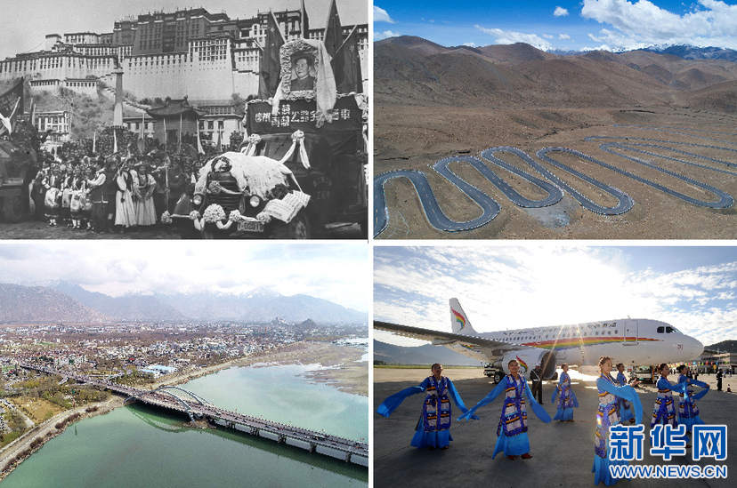 这是一张拼版照片:左上图为1954年12月25日,康藏(今川藏)、青藏两条公路通车仪式在布达拉宫前举行(资料照片);左下图为横跨在拉萨河上的拉萨市区公路(2019年4月3日新华社记者晋美多吉摄,无人机照片);右上图为通往珠峰的公路(2017年5月19日新华社记者普布扎西摄);右下图为西藏航空有限公司成立并举行首航仪式(2011年7月26日新华社记者觉果摄)。新华社发