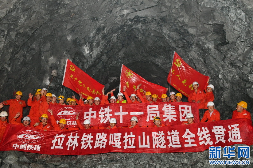 2018年4月7日,中铁十一局施工人员庆祝拉林铁路第一座隧道工程——嘎拉山隧道贯通。新华社记者 张汝锋 摄