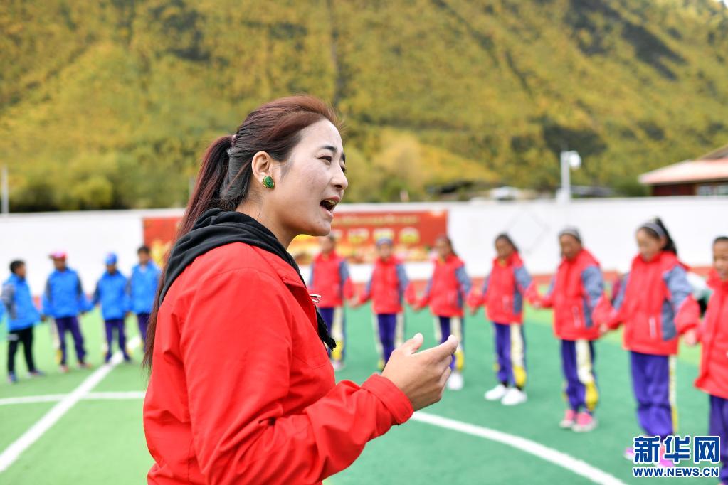 在西藏林芝市波密县多吉乡中心小学,央宗给学生们传授“波央”的发音技巧(2020年10月13日摄)。新华社记者詹彦 摄