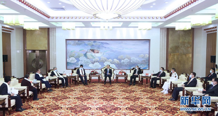 8月18日,以中共中央政治局常委、全国政协主席汪洋为团长的中央代表团飞抵拉萨,出席西藏和平解放70周年庆祝活动。受党中央和习近平总书记委托,汪洋在拉萨饭店看望在藏领导干部、老同志白玛赤林、帕巴拉·格列朗杰和列确、巴桑,以及阿沛·阿旺晋美同志家人代表,向他们表示亲切问候。新华社记者 刘彬 摄