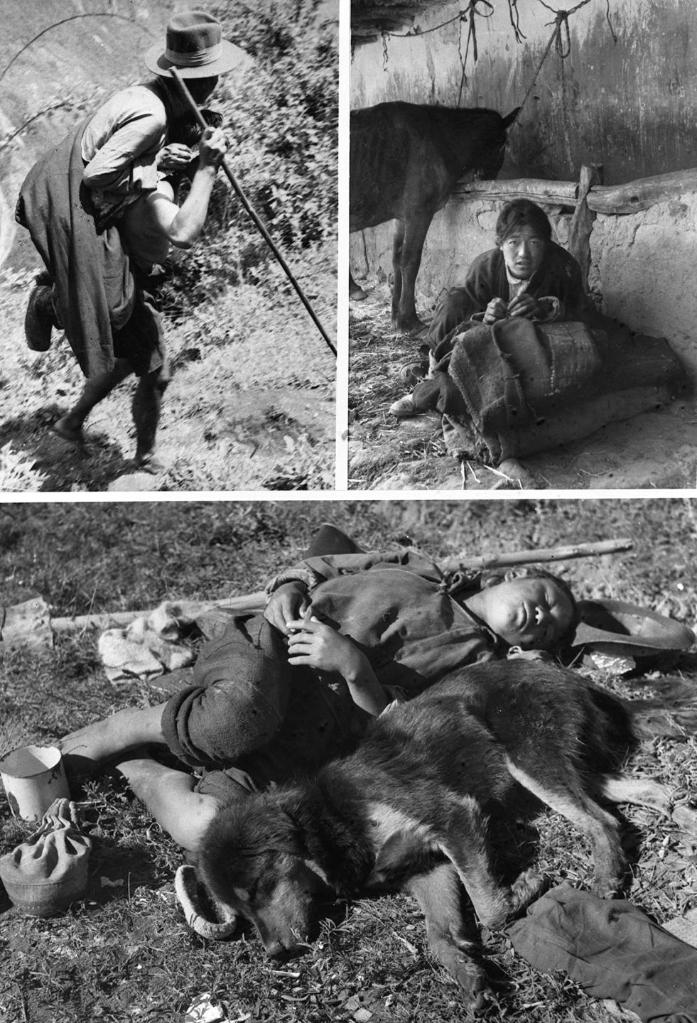 上图左:西藏农奴制度下的“人背人”(即农奴像牲畜一样背驮着农奴主)差役。上图右:和牲口同住的农奴。下图:农奴服劳役后与犬同眠(资料照片)。