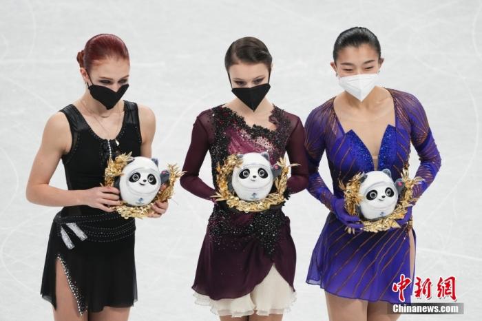 2月17日,冠军俄罗斯奥委会选手安娜·谢尔巴科娃(中)、亚军俄罗斯奥委会选手亚历山德拉·特鲁索娃(左)、季军日本选手坂本花织在颁发纪念品仪式上。当日,北京2022年冬奥会花样滑冰女子单人滑自由滑比赛在首都体育馆举行,俄罗斯奥委会选手安娜·谢尔巴科娃夺得女子单人滑冠军。 中新社记者 毛建军 摄