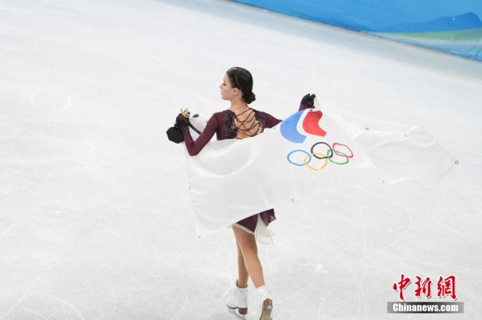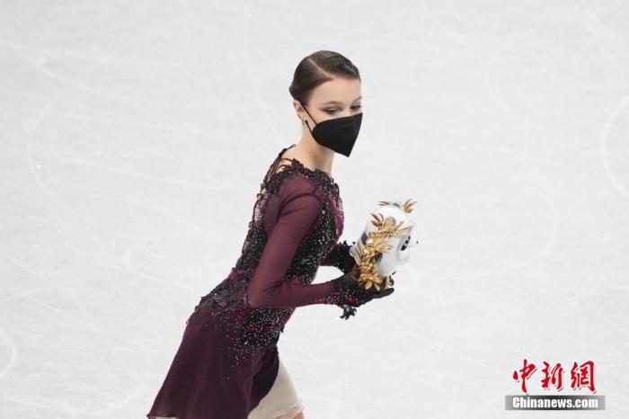 2月17日,俄罗斯奥委会选手安娜·谢尔巴科娃在颁发纪念品仪式后。当日,北京2022年冬奥会花样滑冰女子单人滑自由滑比赛在首都体育馆举行,俄罗斯奥委会选手安娜·谢尔巴科娃夺得女子单人滑冠军。 中新社记者 毛建军 摄