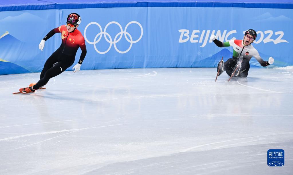 2月7日,中国选手任子威(上右)与匈牙利选手刘少林(上左)在比赛中。新华社记者 兰红光 摄