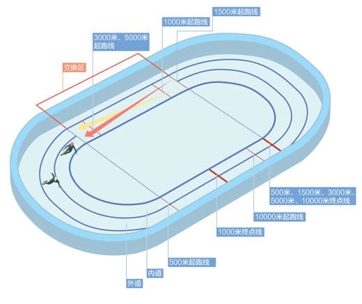 场地不同:速度滑冰场地标准跑道最大周长为400米,最小为333.33米;短道速滑比赛场地内缘周长111.12米。短道速滑比赛,运动员出发后不分道次;速度滑冰比赛分内道、外道,内道半径为25米,外道内圈半径为30米。