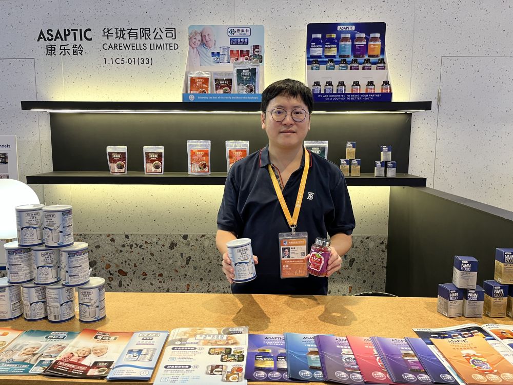今年的“香港产品展区”,除了有家喻户晓的香港品牌,如李锦记、澳至尊、八珍等,还引进了一些新展商,比如华珑有限公司带来的香港初创品牌康乐龄吞咽易。