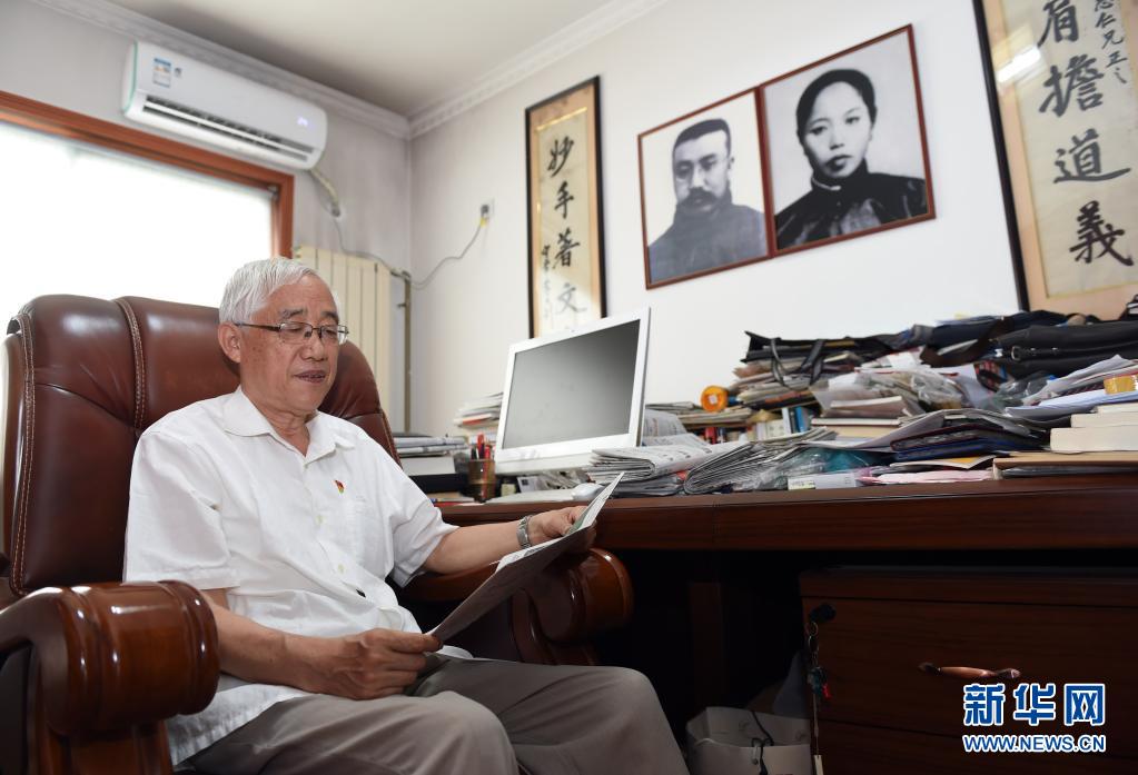 6月12日,李宏塔在家中书房读书,墙上挂着祖父李大钊和祖母赵纫兰的相片。新华社记者 周牧 摄