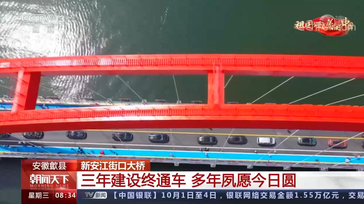 这里是位于安徽黄山歙县的新安江街口大桥,经过3年多的建设,这座大桥今年国庆节前刚刚通车。由于大桥所在的位置属于水源保护区,为避免造成污染,大桥使用一个宽度达239米的主拱直接飞越新安江两岸。