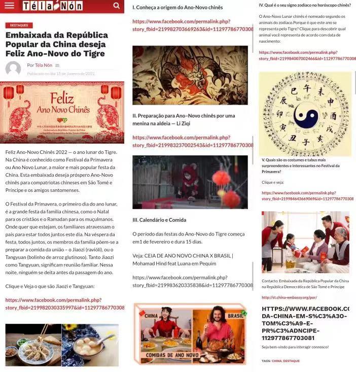 春节前夕,中国驻圣多美和普林西比使馆在当地主要门户网站特拉侬网(Téla Nón)设立虎年春节专栏,向广大旅圣普侨胞、中资机构和留学生以及圣普人民送上新春祝福,并介绍中国春节习俗趣事,掀起迎接中国新年的热潮。