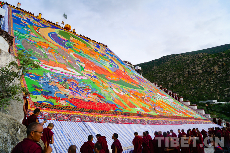 当清晨第一缕阳光越过根培乌孜山崖,照在置放唐卡的山坡上时,巨幅强巴佛唐卡上的黄绸布缓缓揭开,露出尊容。僧俗信众有序围绕在巨幅佛像唐卡下,虔诚顶礼叩拜,并往唐卡上抛哈达,表达祈求吉祥如意的心愿。