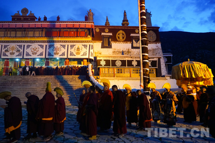 天还未亮,在哲蚌寺措钦大殿内,僧人们已早早准备,做好展佛前的各项工作。伴随着措钦大殿内低沉的诵经声、大殿外长鸣的法号和齐响的法螺,许多青壮年僧人将巨幅唐卡卷轴呈蛇形缓缓抬出大殿,朝着哲蚌寺后山前进,不少群众主动加入,共同参与这一时刻。