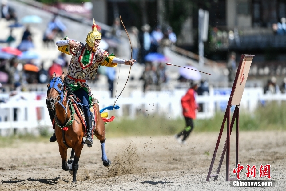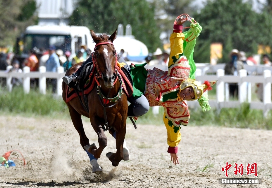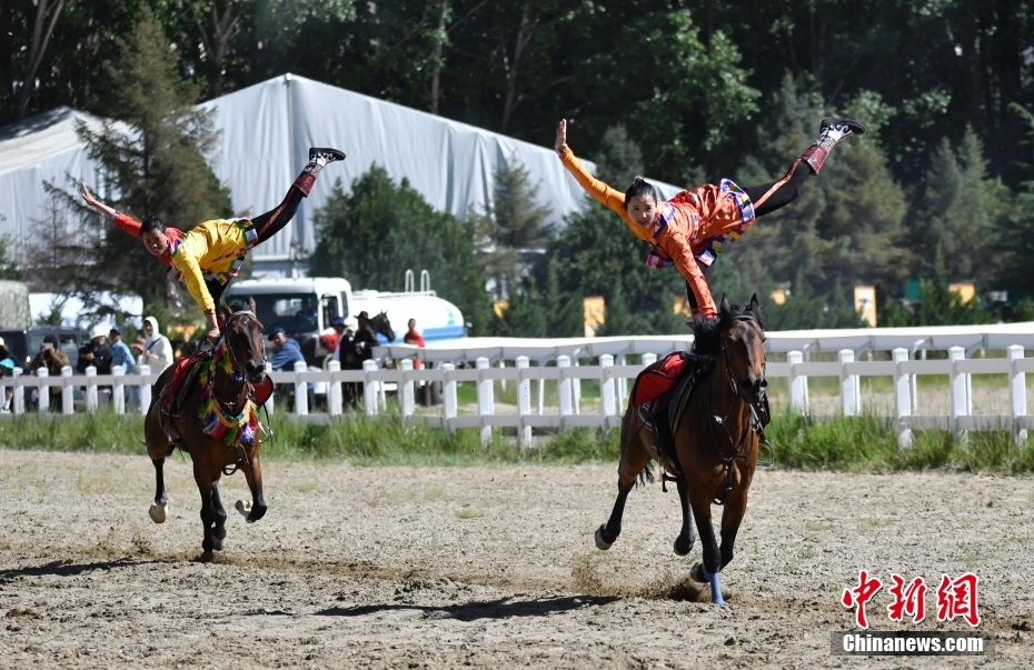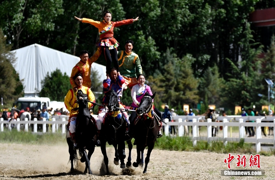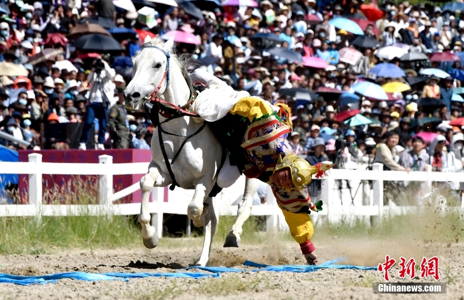 8月17日,骑手们进行马术表演。当日,2023年拉萨雪顿节民族传统马术表演在西藏拉萨市北郊赛马场举行。