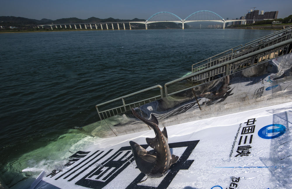 在湖北省宜昌市举行的“2022年长江三峡中华鲟放流活动”现场,中华鲟从放流通道滑入长江(4月9日摄)。新华社发(郑家裕 摄)