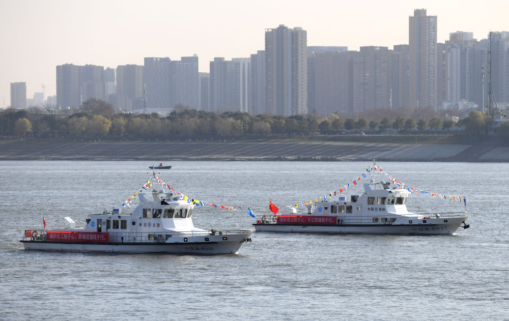 渔政执法船队从长江武汉段江面驶过,启动长江流域重点水域“十年禁渔”(2020年12月31日摄)。新华社记者 程敏 摄