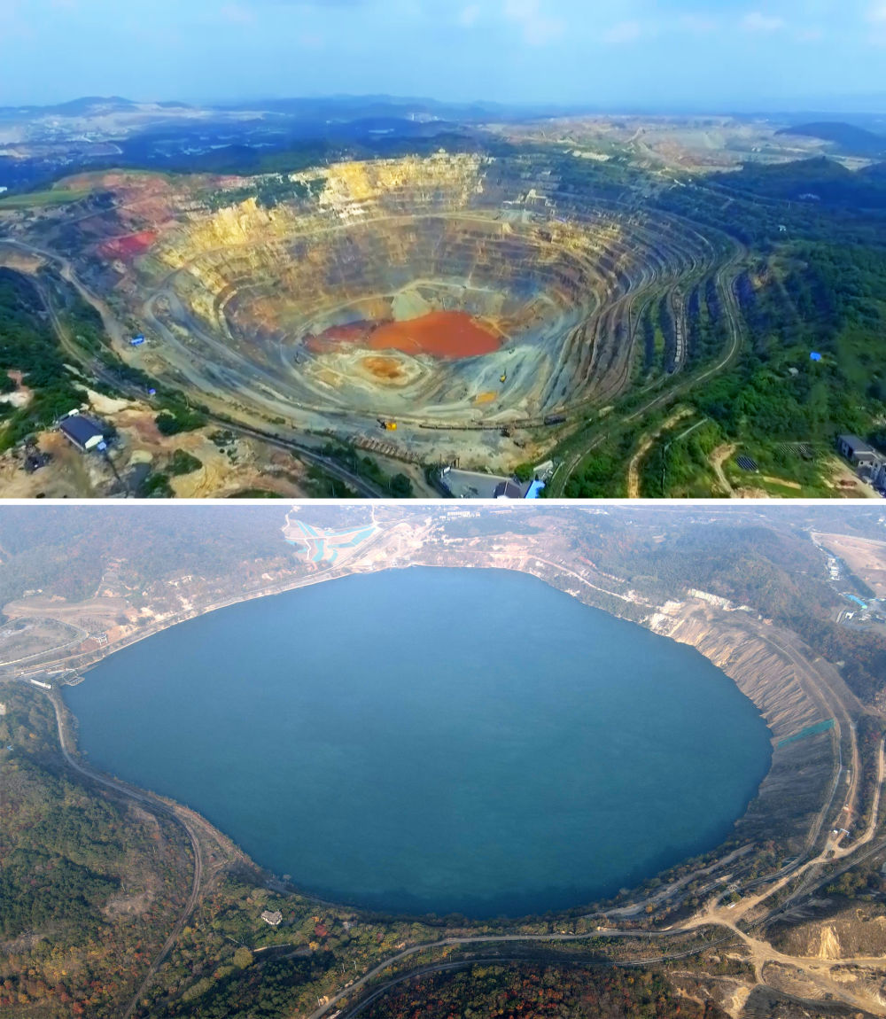 拼版照片:上图为开采中的安徽省马鞍山市雨山区向山镇凹山采场(资料照片),下图为生态修复后的凹山采场(新华社记者刘军喜11月8日摄,无人机照片)。新华社发