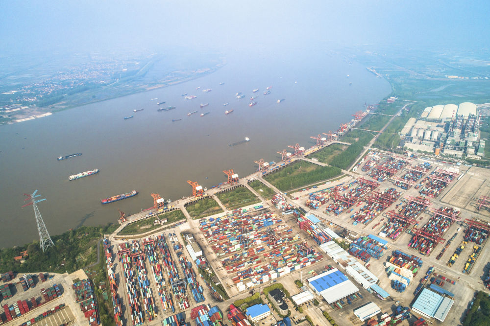 这是武汉长江中游航运中心核心港阳逻港(2020年4月12日摄,无人机照片)。新华社记者 肖艺九 摄