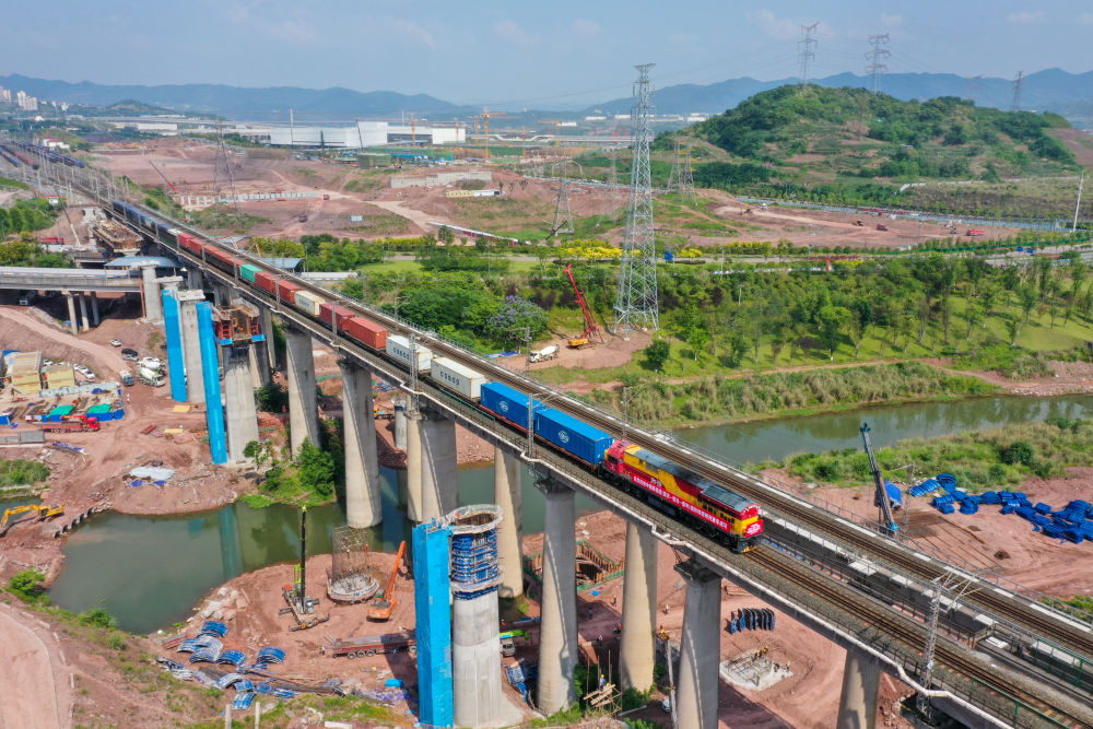 中缅新通道(重庆—临沧—缅甸)国际铁路班列从重庆果园港鱼嘴车站顺利发车(5月23日摄,无人机照片)。新华社记者 唐奕 摄