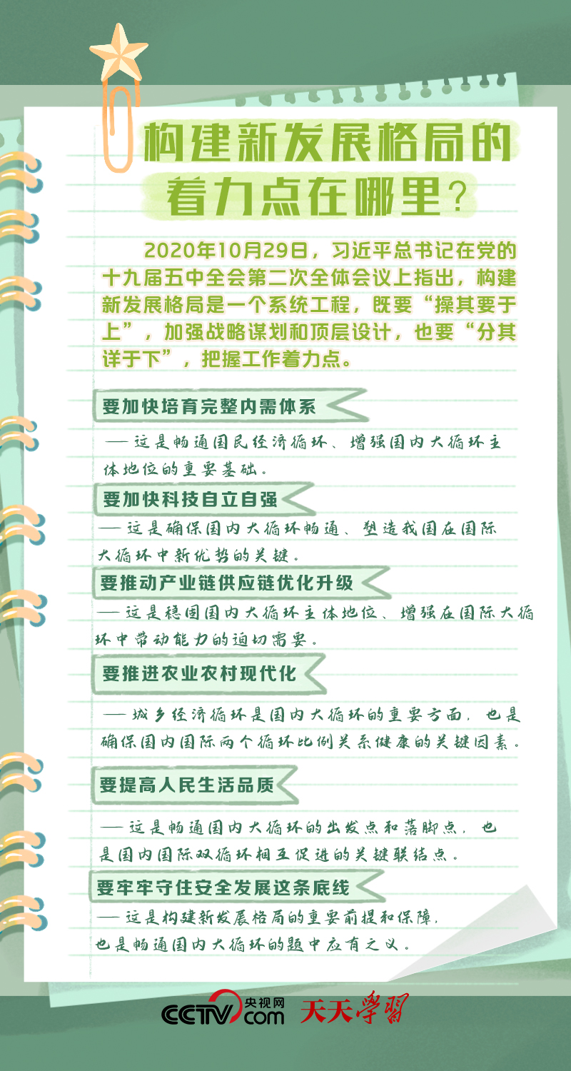 天天学习构建以国内大循环为主体、国内国际双循环相互促进的新发展格局,是根据我国发展阶段、环境、条件变化,特别是基于我国比较优势变化,审时度势作出的重大决策。构建新发展格局是事关全局的系统性、深层次变革,是立足当前、着眼长远的战略谋划。