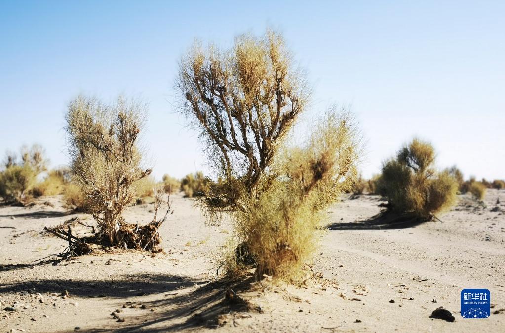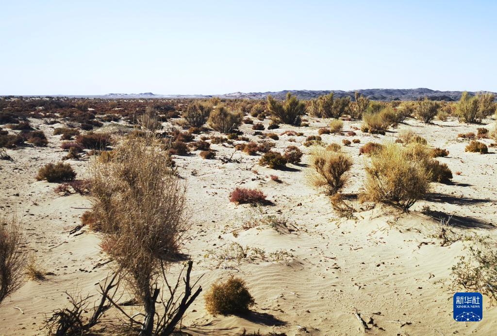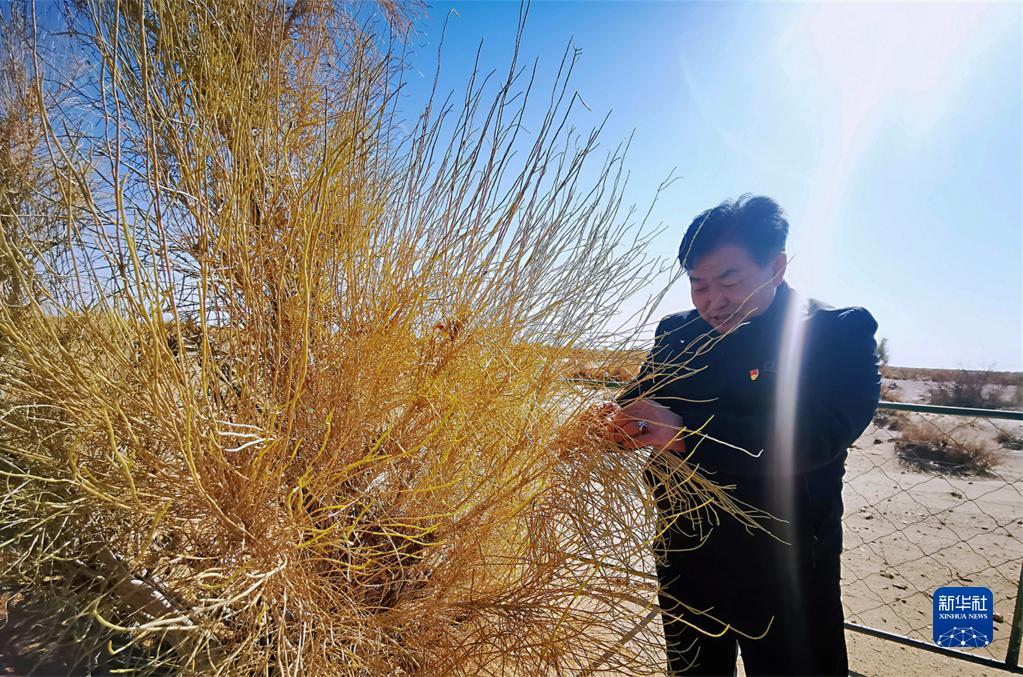 11月4日,内蒙古巴彦淖尔市乌拉特后旗巴音查干嘎查党支部书记宝玉查看梭梭长势。新华社记者 李云平 摄
