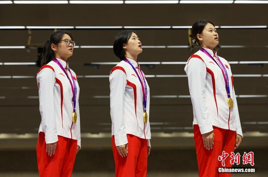 9月27日,杭州第19届亚运会射击女子50米步枪3种姿势团体赛举行,中国队以1773的总分取得金牌。图为中国选手韩佳予、夏思钰、张琼月(从左至右)在颁奖仪式上唱国歌。