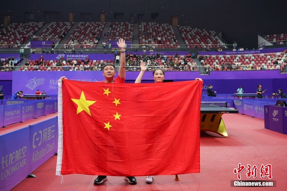 10月25日,杭州第4届亚残运会乒乓球女子单打Class 8决赛在拱墅运河体育公园体育馆进行。中国队选手黄文娟以3比2战胜日本队选手友野有理获得冠军。图为黄文娟(右)与教练在比赛后向观众挥手致意。
