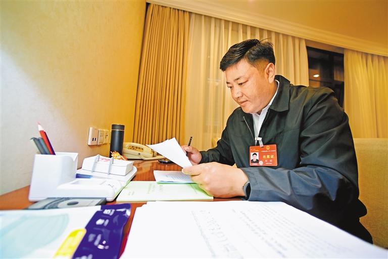 图为全国人大代表拉琼在会前完善发言材料。