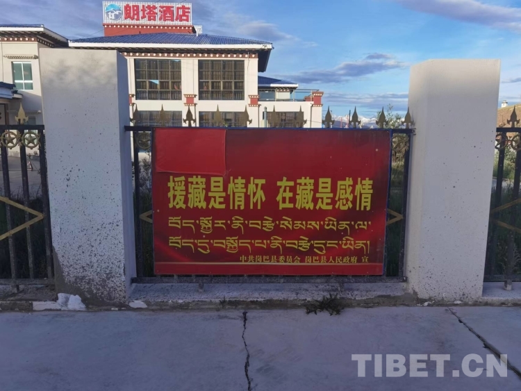 图为岗巴县城“援藏是情怀,在藏是感情”标语 (2022年7月拍摄)