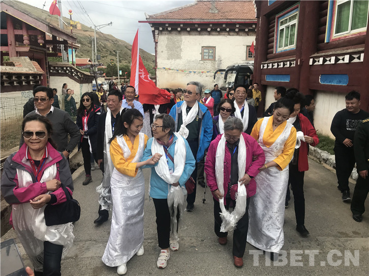 图为走进虾拉沱村的十八军老战士及十八军后代。摄影:龙真多吉