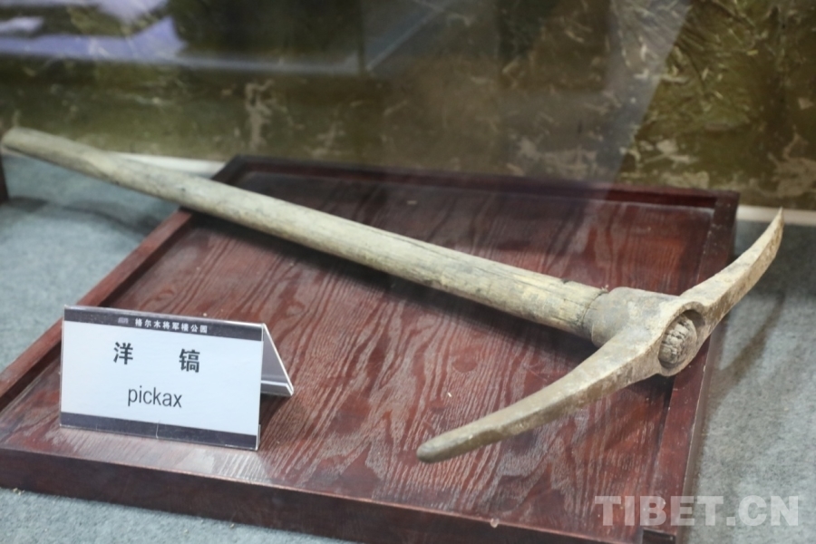 图为格尔木将军楼公园青藏公路纪念馆内的展品——洋镐