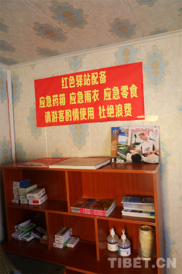 图为佩枯错旁边的石榴籽红色驿站内免费配备的药物、洗手液、纸杯、杂志等物品,记者也将《中国西藏》杂志摆放在内,希望给游客的旅程带去一些收获 摄影:王茜