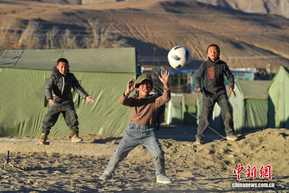 2025年1月7日,西藏日喀则市定日县发生6.8级地震,造成重大人员伤亡。地震发生后,30天内完成民房重建规划、选址、设计,90天内完成灾后恢复重建总体方案编制和报审,震后100天内进入项目全面实施阶段,220天实现灾后恢复重建首批入住目标,295天实现重建民房、维修加固民房基本建成并交付受灾民众,在海拔4300米以上极度缺氧、建材短缺、施工力量薄弱的地震灾区,创造了“当年受灾、当年入住”的重建奇迹。如今,民众生产生活恢复秩序,他们将在新居内迎接第一个日喀则农事新年。图为2025年1月10日,在西藏日喀则市定日县长所乡森嘎村安置点,夕阳下,孩子们分组开展点球大战。贡确 摄