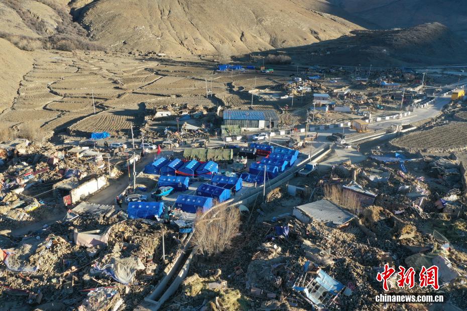 2025年1月7日,西藏日喀则市定日县发生6.8级地震,造成重大人员伤亡。地震发生后,30天内完成民房重建规划、选址、设计,90天内完成灾后恢复重建总体方案编制和报审,震后100天内进入项目全面实施阶段,220天实现灾后恢复重建首批入住目标,295天实现重建民房、维修加固民房基本建成并交付受灾民众,在海拔4300米以上极度缺氧、建材短缺、施工力量薄弱的地震灾区,创造了“当年受灾、当年入住”的重建奇迹。如今,民众生产生活恢复秩序,他们将在新居内迎接第一个日喀则农事新年。图为2025年1月8日,西藏自治区定日县长所乡古荣村,安置点的帐篷。(无人机照片)贡嘎来松 摄