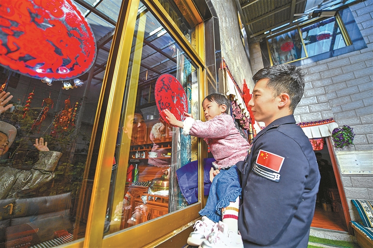 民警抱着普布仓决的小孙女贴窗花。旦增嘎瓦 摄