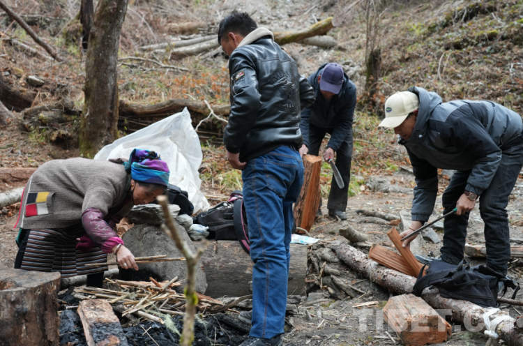 过了两个小时,我们到达了平时巡边人休息的地方。有人捡柴火、有人去接水,每个人都分工明确。扎西江村的背包里带着方便面、优乐美奶茶、可乐等,巡边的每位队员都拿出了自己包里的食物与大家分享。大家围坐一起有说有笑,完全忘记了一路的艰辛与疲惫。