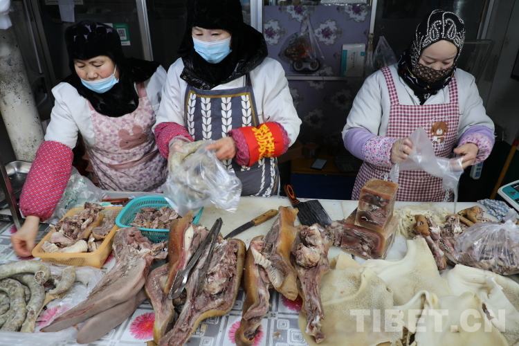 图为商家在忙碌地卖牛羊肉 摄影:龙真多吉