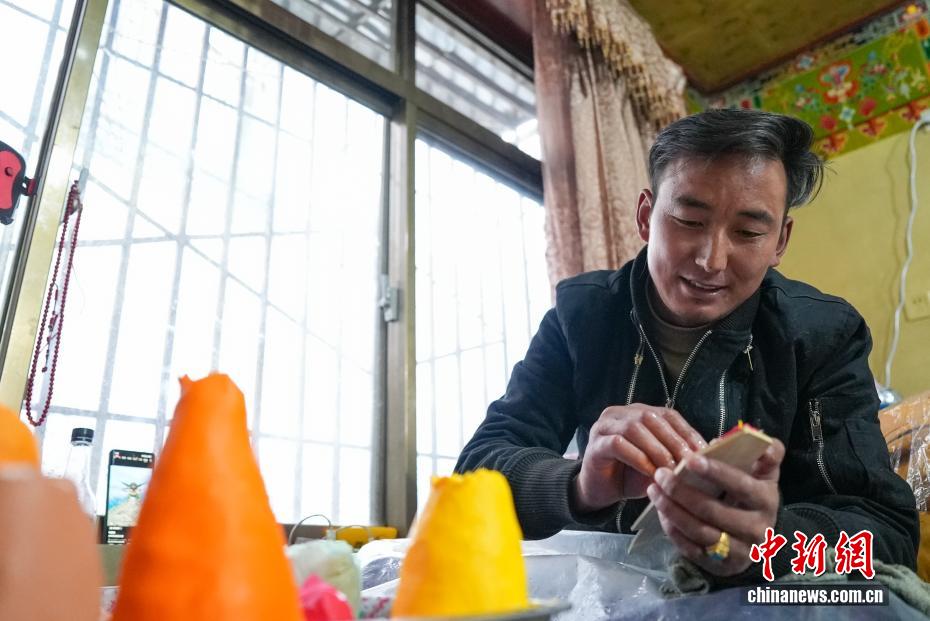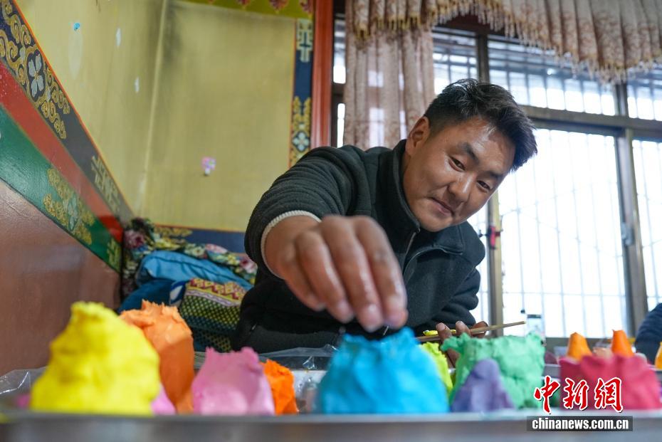 2月4日,随着藏历新年临近,拉萨街头年味渐浓,年货市场上的“孜扎”迎来热销。酥油花藏语称“孜扎”,是藏历新年吉祥物切玛盒的重要组件,也是藏族民众家中必备的年货。酥油花以酥油为主要原料,由匠人纯手工捏制而成,造型涵盖佛像、人物、花卉树木、飞禽走兽等,常见图案包含吉祥八宝、和谐四瑞、长寿图等,承载着藏族民众对新年平安吉祥、万事顺遂的美好祈愿。图为手工艺人在制作酥油花。贡确 摄