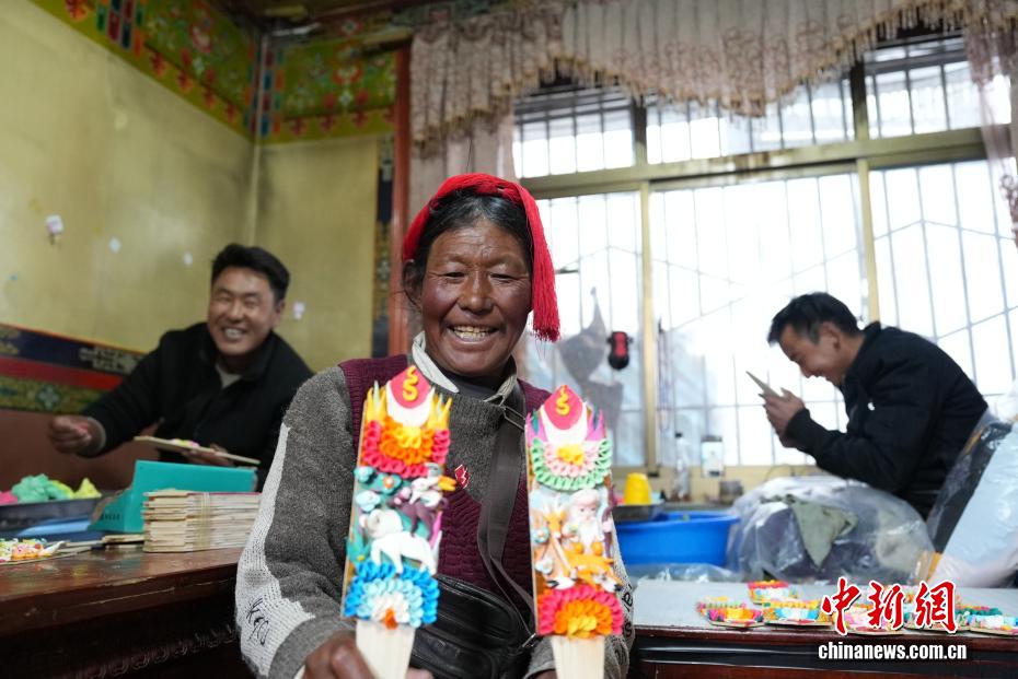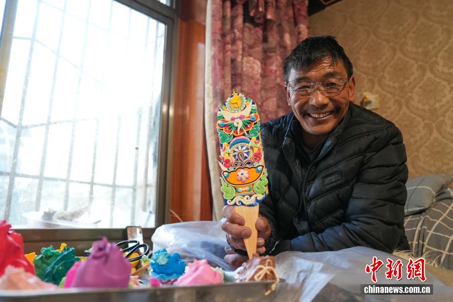 2月4日,随着藏历新年临近,拉萨街头年味渐浓,年货市场上的“孜扎”迎来热销。酥油花藏语称“孜扎”,是藏历新年吉祥物切玛盒的重要组件,也是藏族民众家中必备的年货。酥油花以酥油为主要原料,由匠人纯手工捏制而成,造型涵盖佛像、人物、花卉树木、飞禽走兽等,常见图案包含吉祥八宝、和谐四瑞、长寿图等,承载着藏族民众对新年平安吉祥、万事顺遂的美好祈愿。图为手工艺人展示制作完成的酥油花。贡确 摄