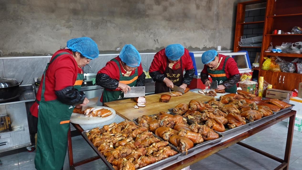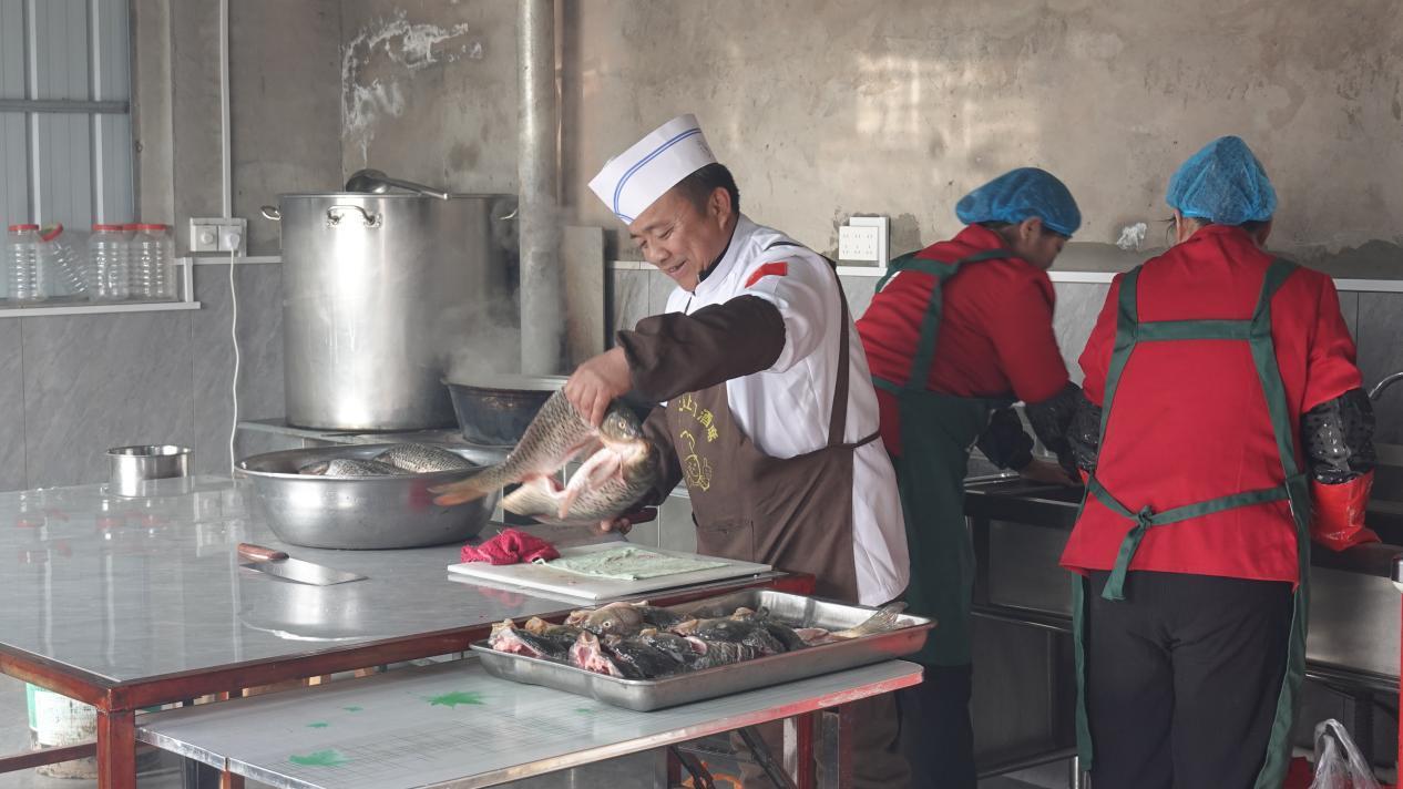 食材加工间里,村民蒋淑芳正在仔细刷猪蹄,她是团队里的老人了。这份工作,她很知足,工资每月多的时候能挣四五千。负责切菜的漫玉也是南屯村人,今年55岁,她原本在城里的餐厅打工,去年底为了照顾生病的哥哥,辞工回了家,也加入了巩大厨的团队。