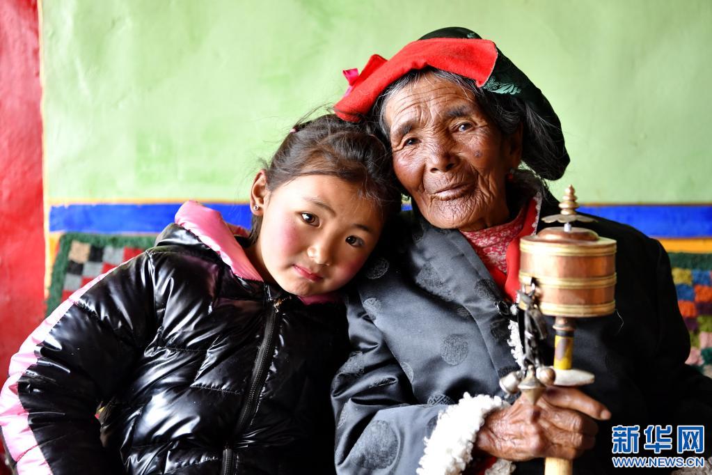 拉确老人(右)和重外孙女白玛央拉在一起(4月16日摄)。新华社记者 张汝锋 摄