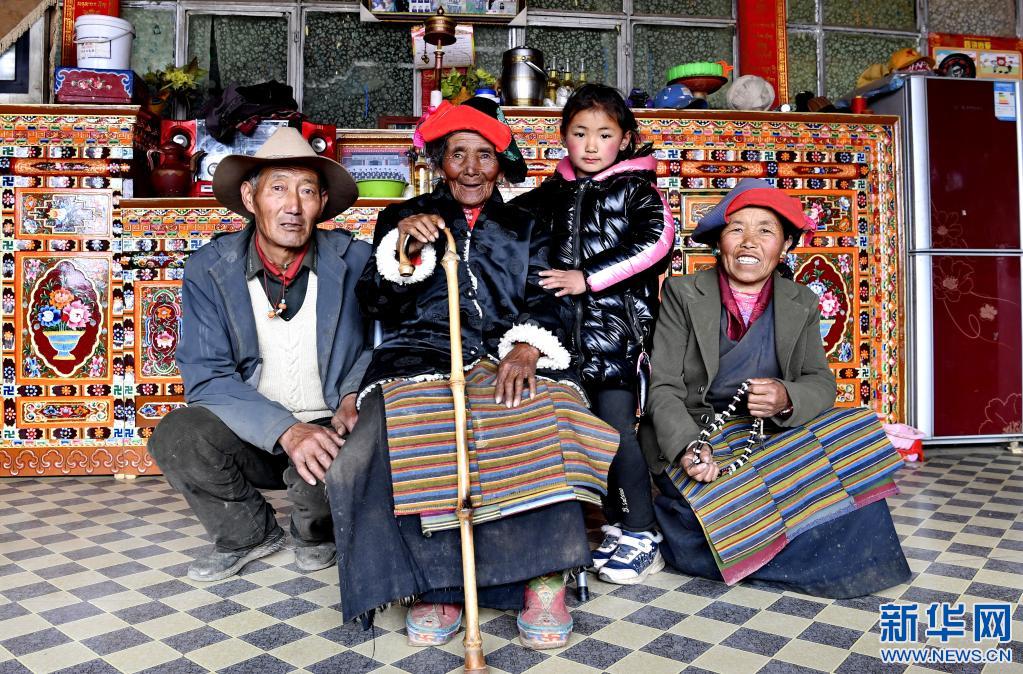 拉确老人(左二)和大女婿巴桑(左一)、大女儿桑姆(右一)及重外孙女白玛央拉一起在家中合影(4月16日摄)。新华社记者 张汝锋 摄