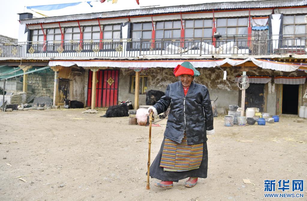 拉确老人在院子里散步(4月16日摄)。新华社记者 张汝锋 摄