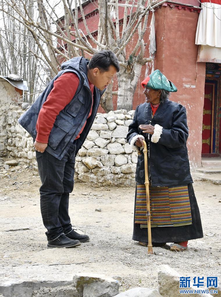 拉确老人(右)和来走访的乡干部唠家常(4月16日摄)。新华社记者 张汝锋 摄