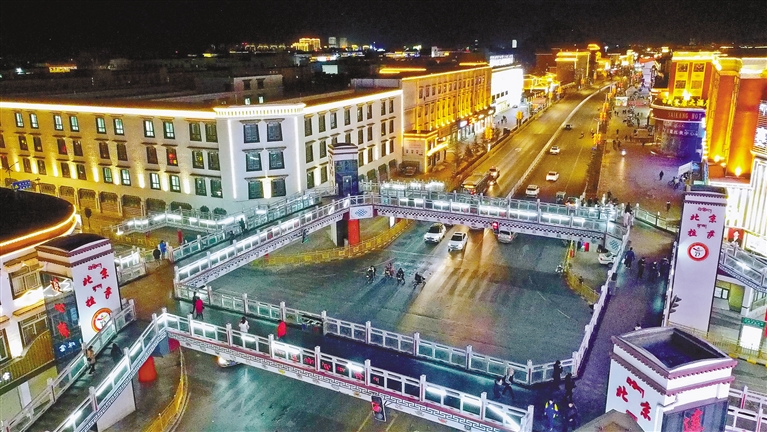 北京市第九批援藏工作队投入1743.4万元建设的、拉萨首座配置电梯的城市人行天桥—“连心桥”。
