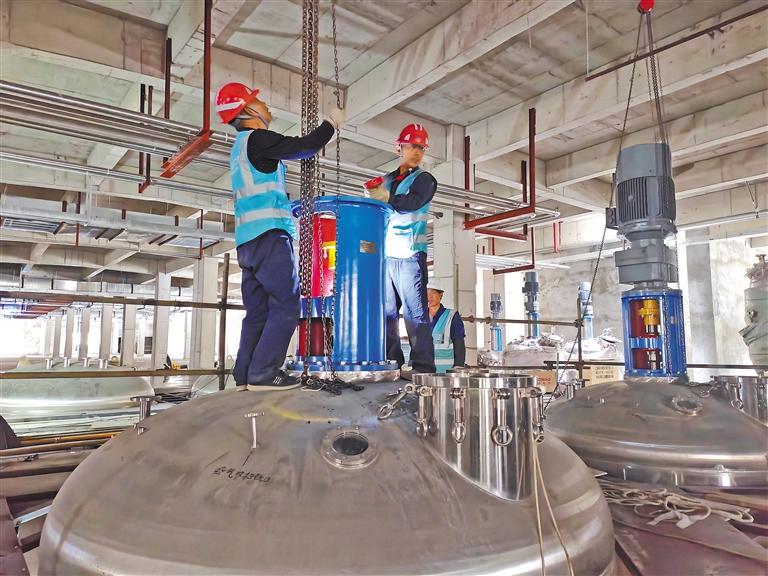 图为西藏安琪生物科技有限公司工作人员在吊装生产设备。