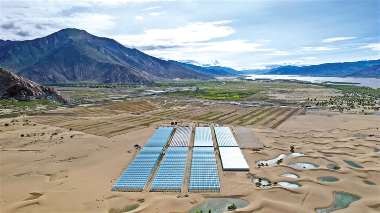 国家农业产业化示范企业——西藏绿之源现代农业科技股份有限公司二期项目,如同一片“绿洲”镶嵌在沙丘之中。