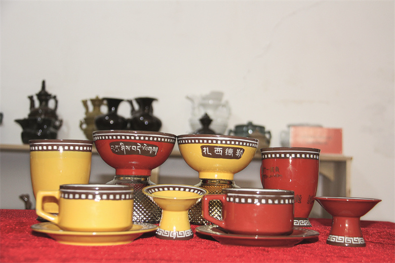 藏族风格的陶瓷茶杯和碗。白玉芬 摄